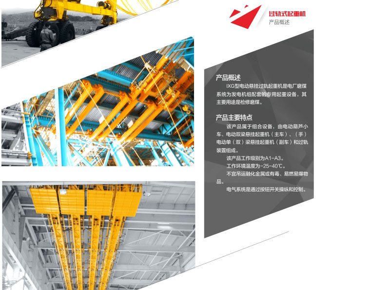 1、 XG型電動懸掛過軌起重機是電廠磨煤系統(tǒng)為發(fā)電機組配套的專用起重設備,其主要用途是檢修磨煤。
