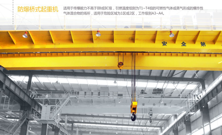 1、 QB型防爆吊鉤橋式起重機所有電機、電器防爆性能符合GB3836.2-2000《爆炸性氣體環(huán)境用防爆電氣設(shè)備第2部分:隔爆型“d”》,整機性能符合JB/T5897-2006《防爆橋式起重機》標(biāo)準(zhǔn)之規(guī)定,經(jīng)國家指定的防爆產(chǎn)品檢驗單位檢驗合同,取得了《防爆合格證》。防爆標(biāo)志分別為ExdⅡBT4、ExdⅡCT4。