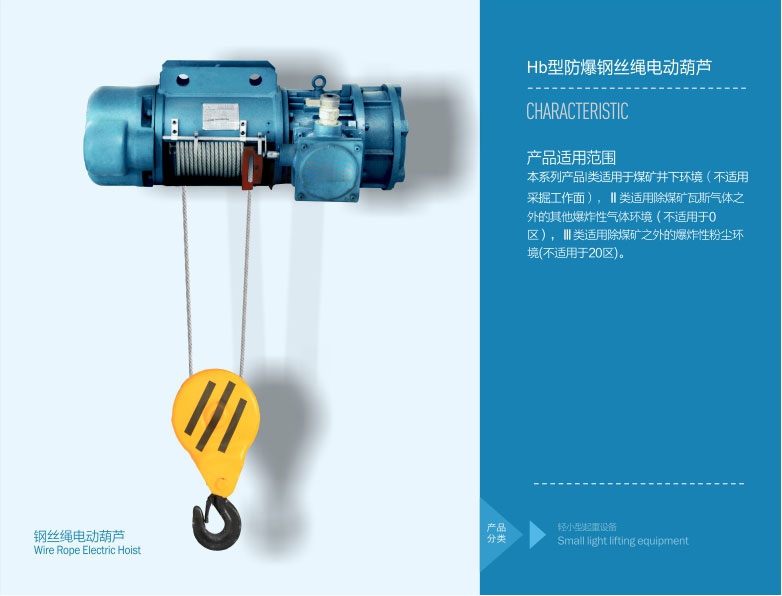 3、 防爆鋼絲繩電動(dòng)葫蘆可與車間固定懸掛軌道配合單獨(dú)使用,也可與LXB防爆電動(dòng)懸掛單梁、LB防爆電動(dòng)單梁、防爆葫蘆雙梁配套使用。