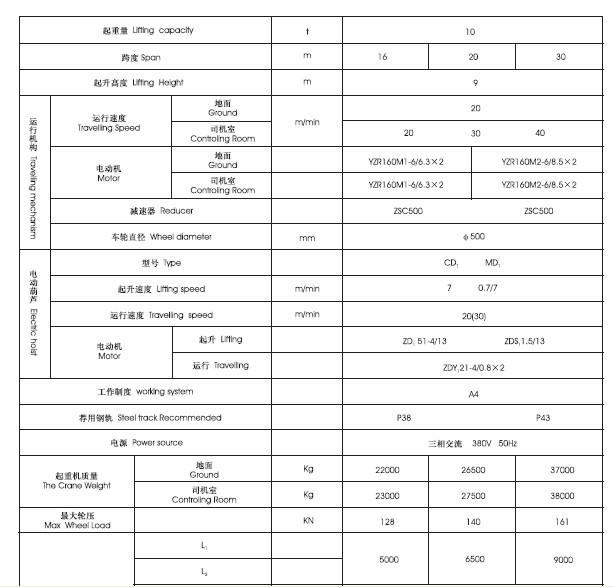 2、適用起重量5-10噸,適用跨度12-30米,工作環境-20℃-+40℃內。